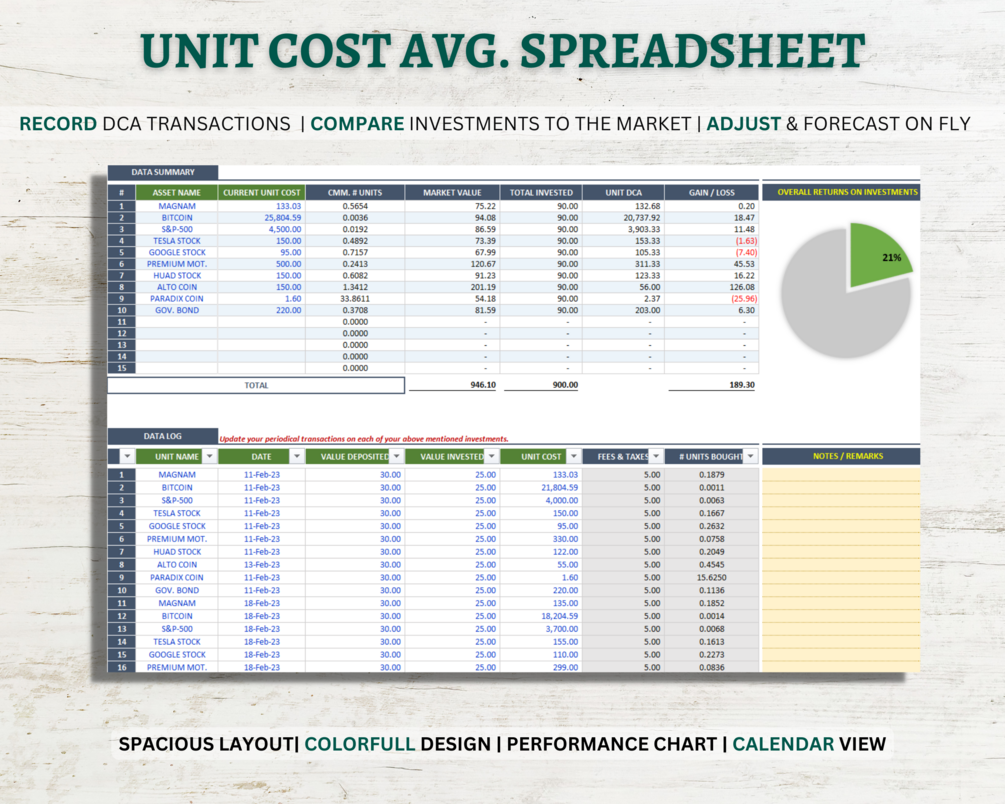 - UNIT COST AVG.: This is the main Dashboard where you update your investment details and figures, and also view the up-to-date status of gains/losses in comparison to market figures.