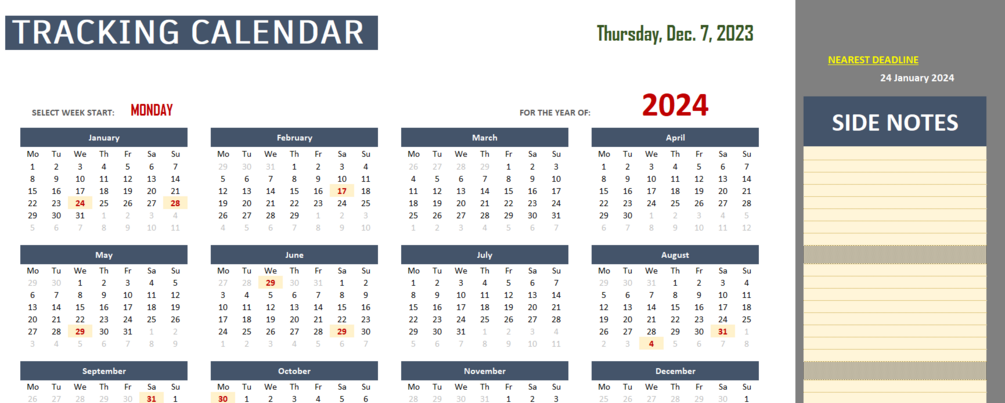 - Adequate space to record all notes and details about the event/deadline.